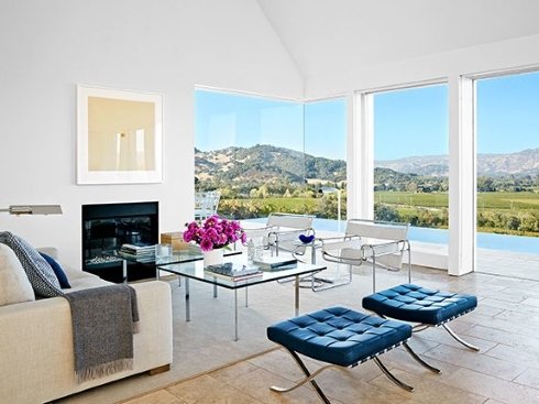 Superbly sited, the home merges seamlessly with the vineyard-laden hills fanning out from the valley below. A glazed wall offers panoramic views from inside.